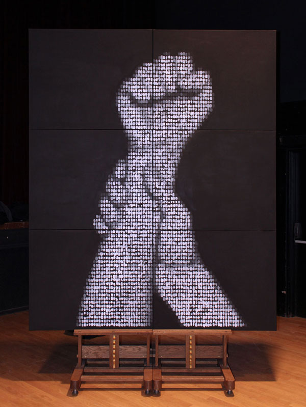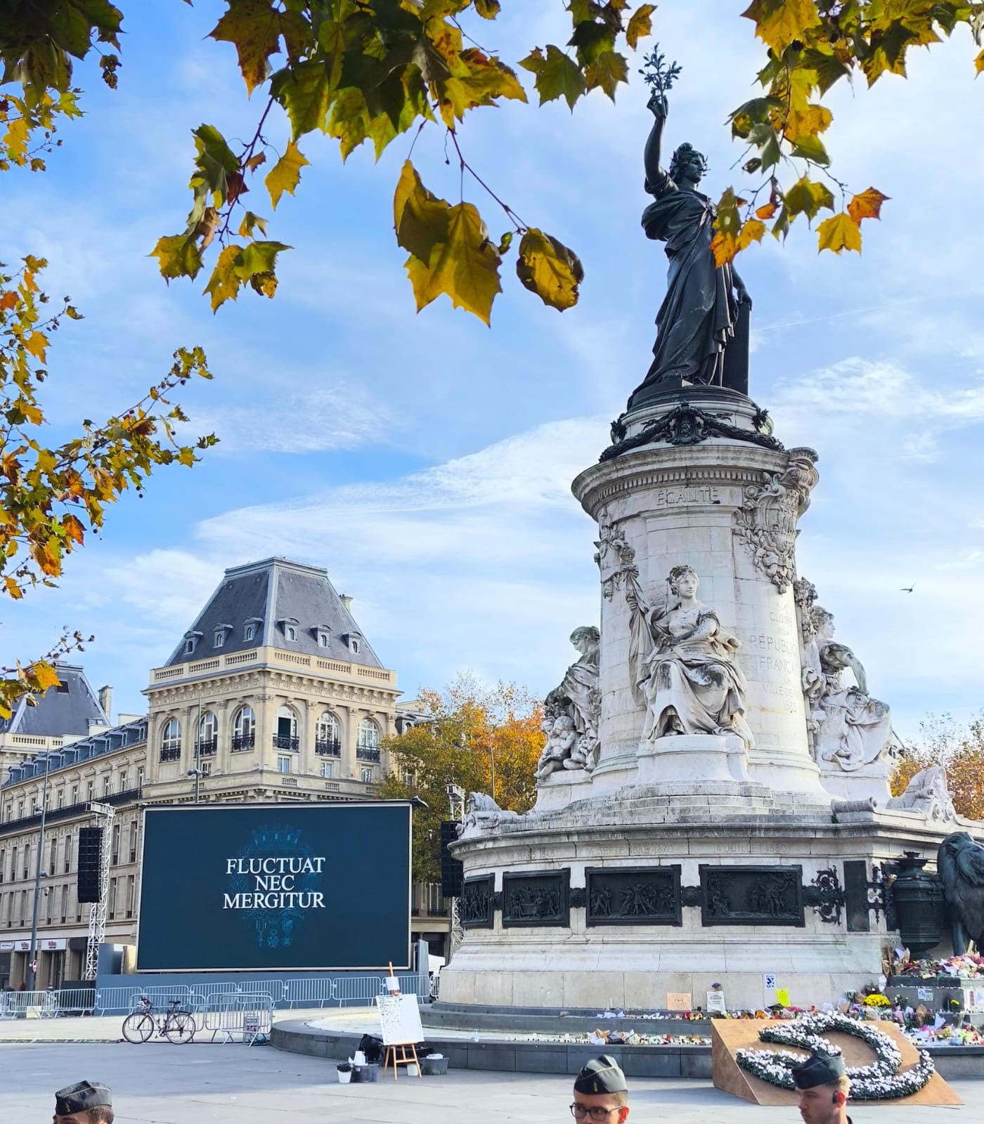 Le jeudi 13 novembre, l’œuvre était présente sur la place de la République, lieu de rassemblement pour le public, entre la statue et l’exposition « Face au terrorisme, une mémoire citoyenne » du futur Musée mémorial du terrorisme.